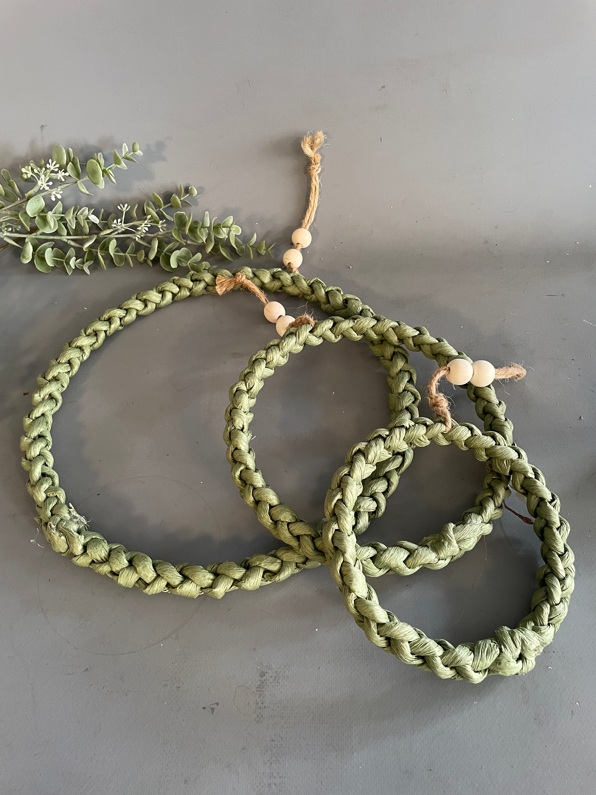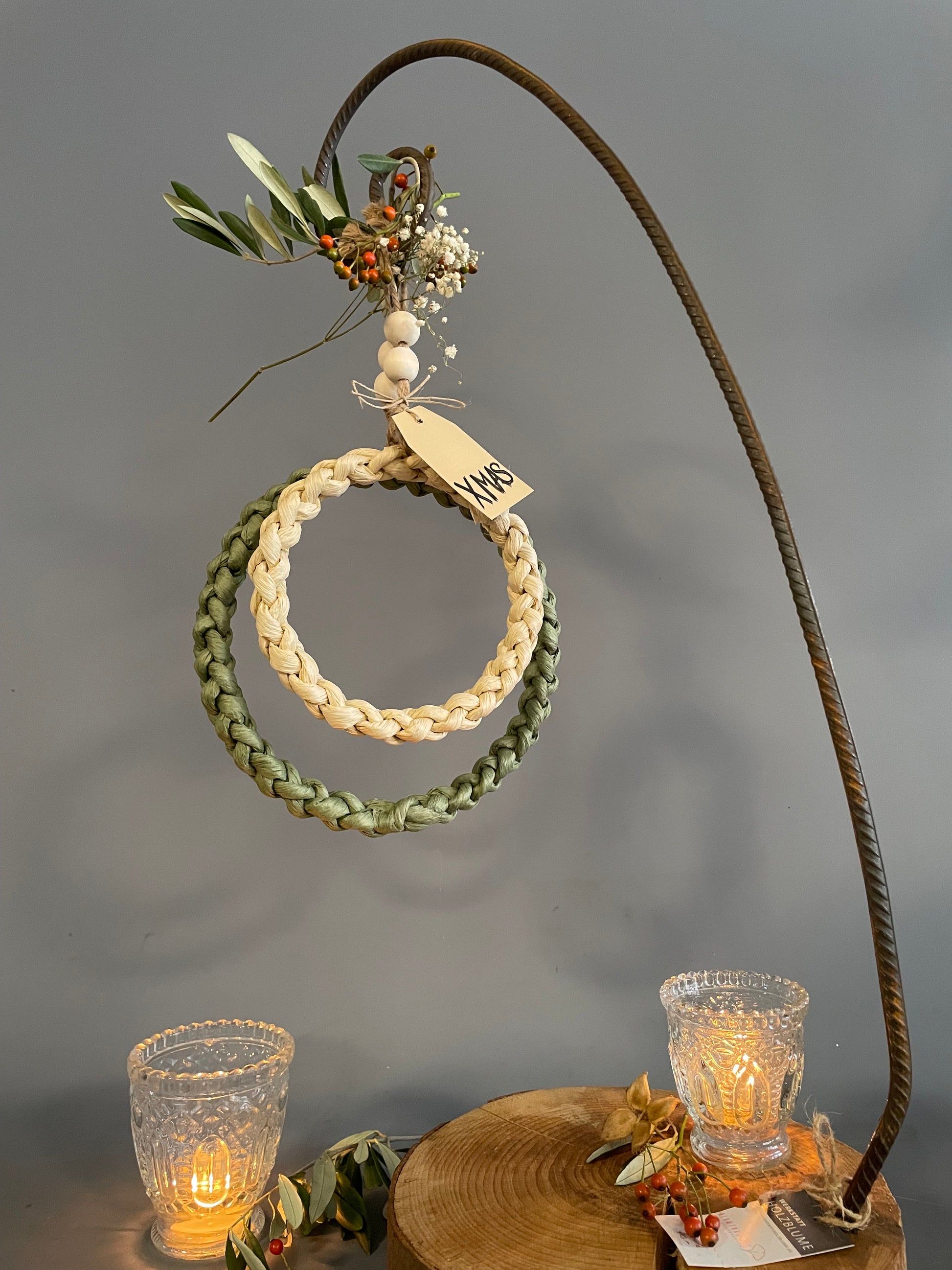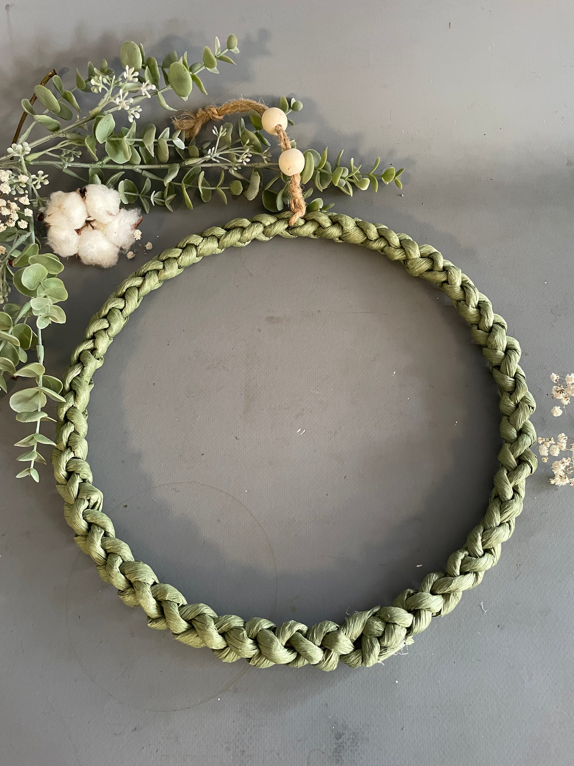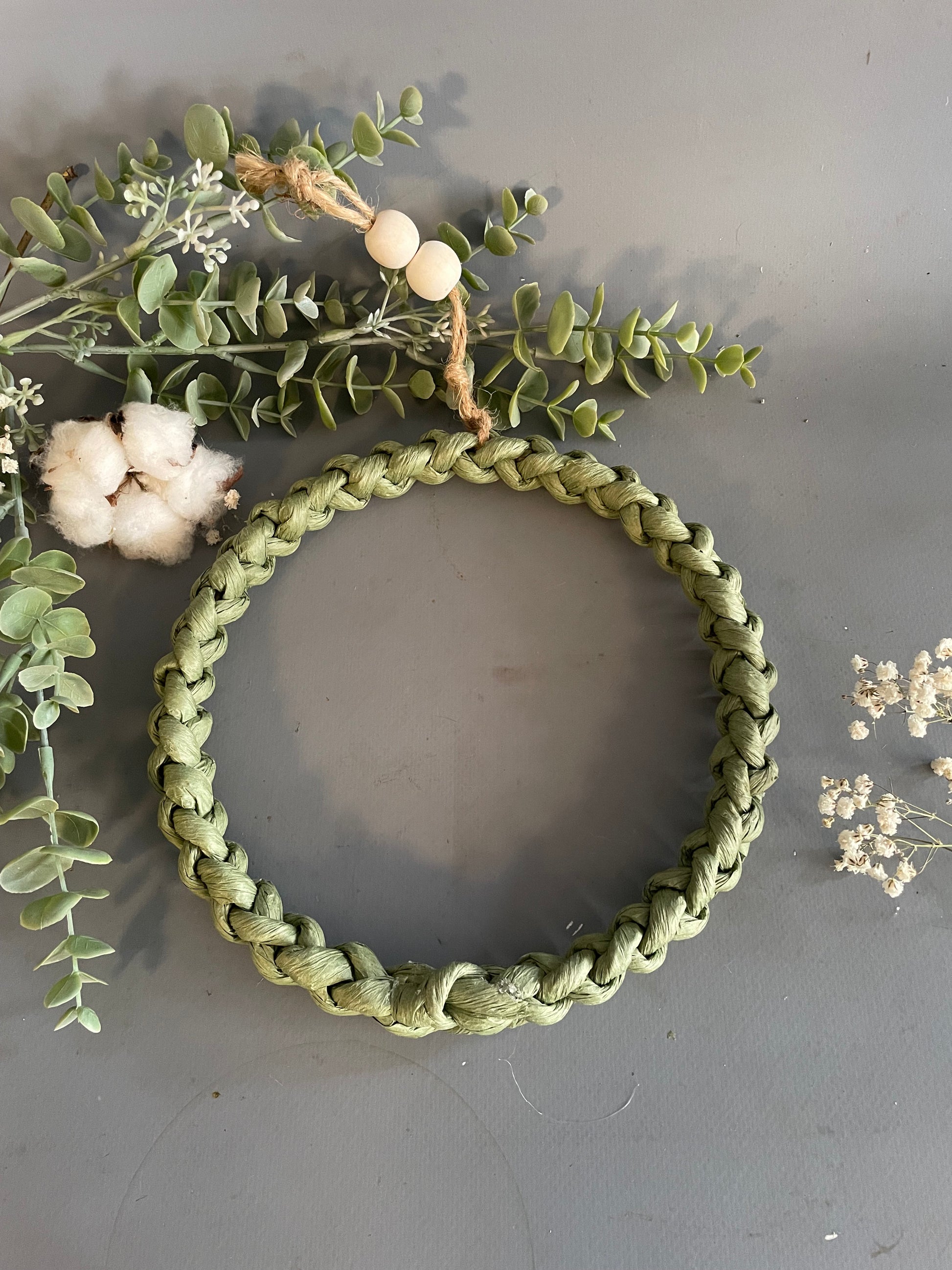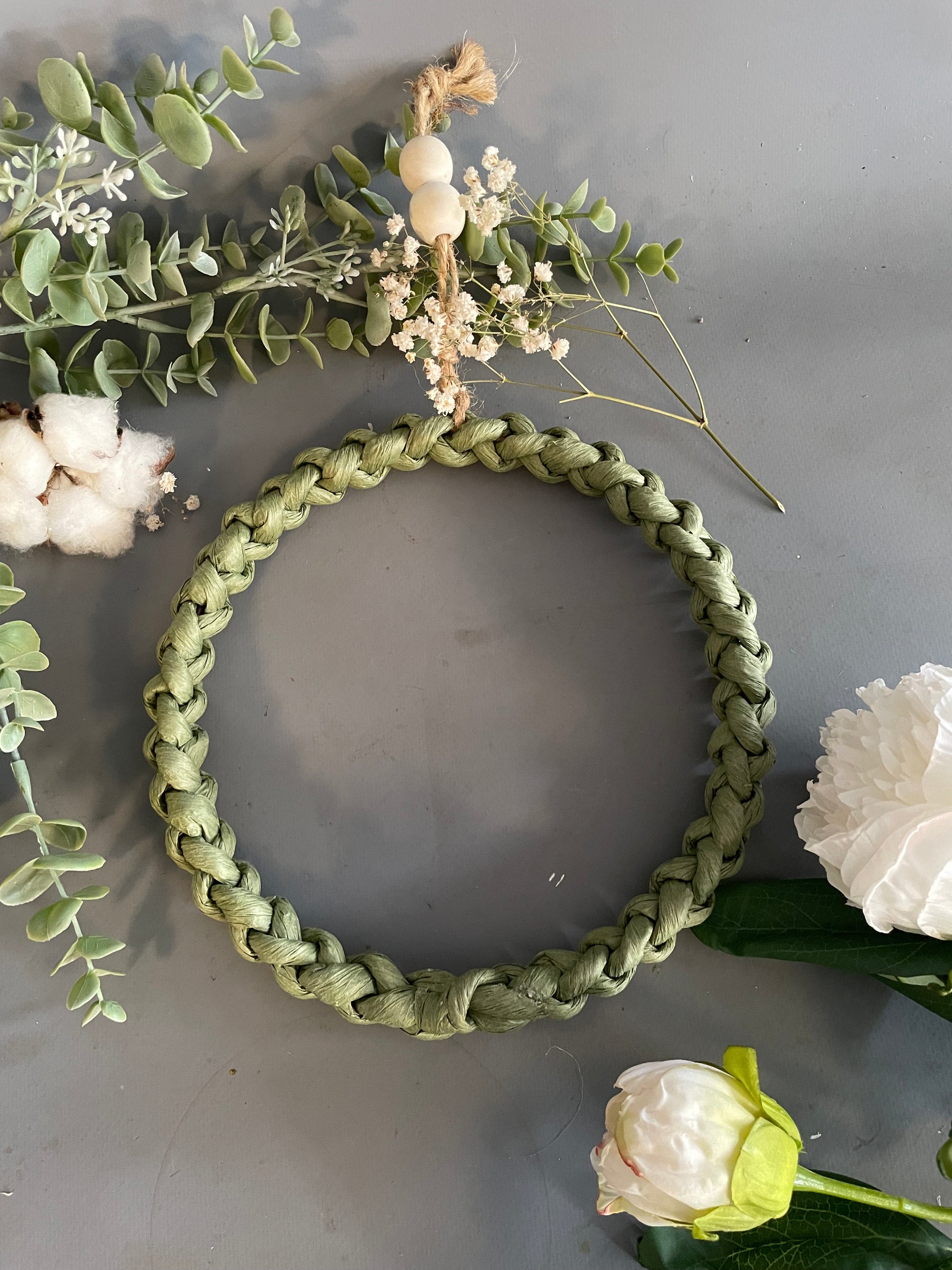 Zeitlos schöner Deko-Ring aus Naturmaterialien. Feste ringförmige mit Papier umwickelt. Mit Kordel zum Hängen in den Farben Olive, Creme und Bordeaux. Ohne Dekoration