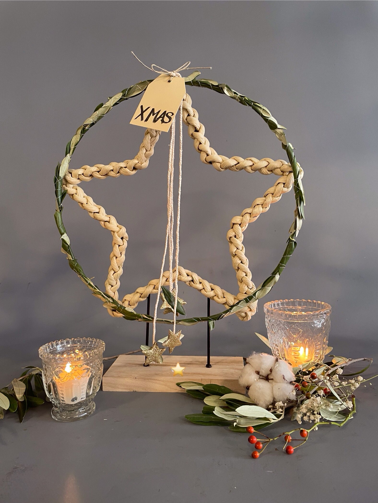 Metallstern mit Papier umwickelt, auf Holzfuß stehend in den Farben: Olive, Creme und Bordeaux