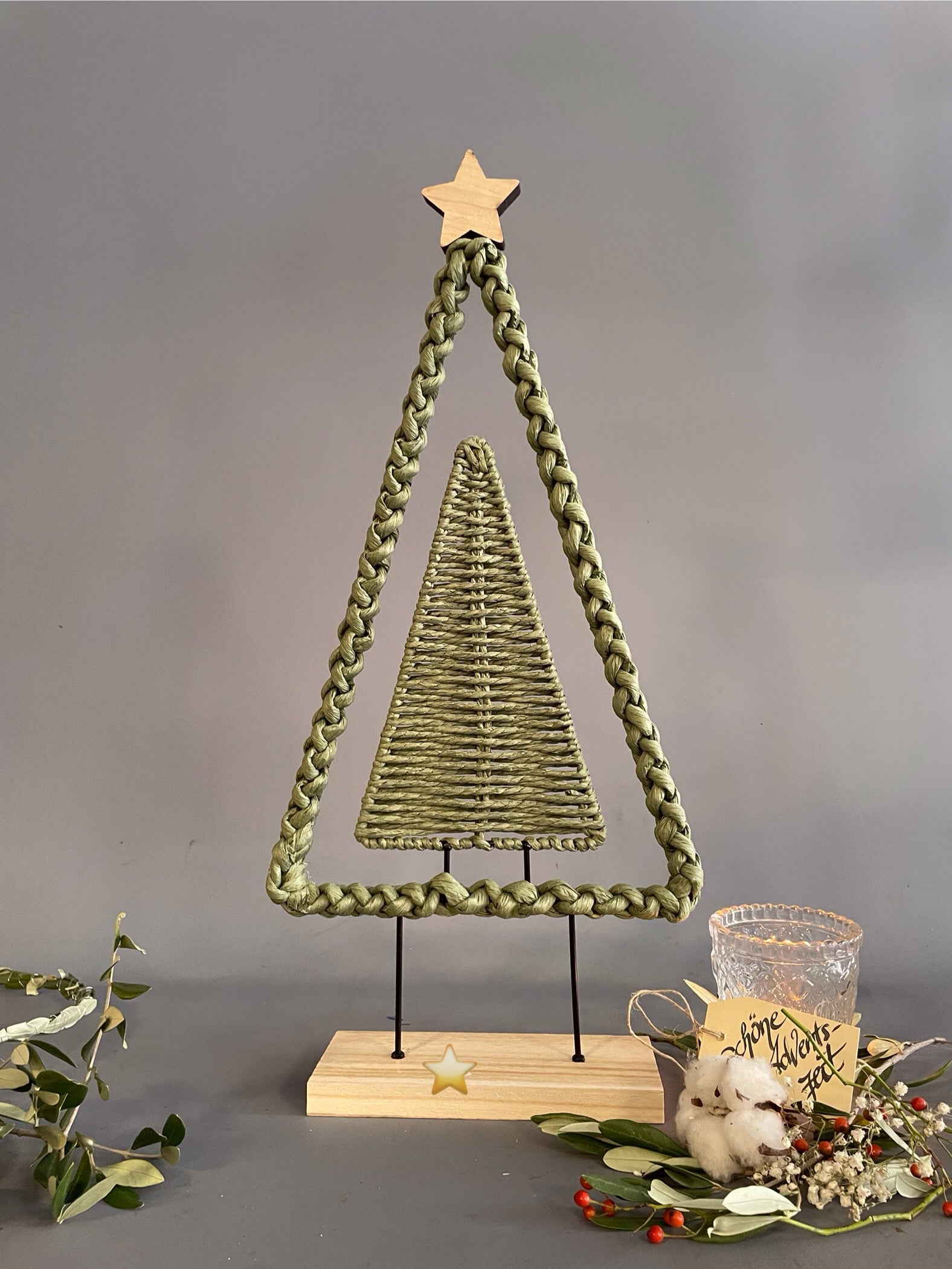 Metallbaum mit Papier umwickelt, in den Farben Olive und Creme. Auf Holzfuß stehend.