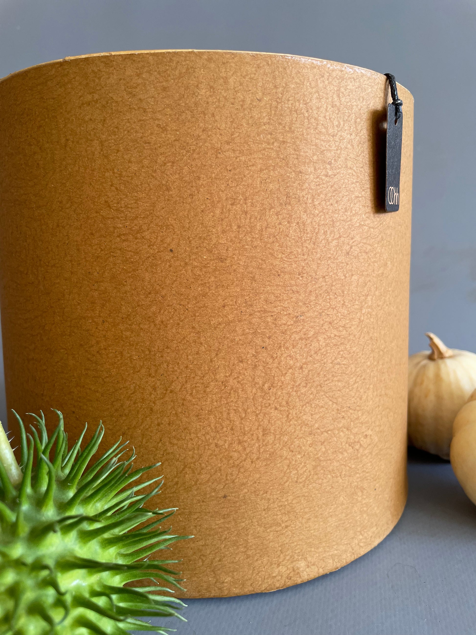 Übertopf aus Altpapier und Holzabfällen, Farbe: trendiges Senf-Braun, Maße: unten 14cm Öffnung 12,5 cm Höhe 13,5cm, innen mit Latex versiegelt.