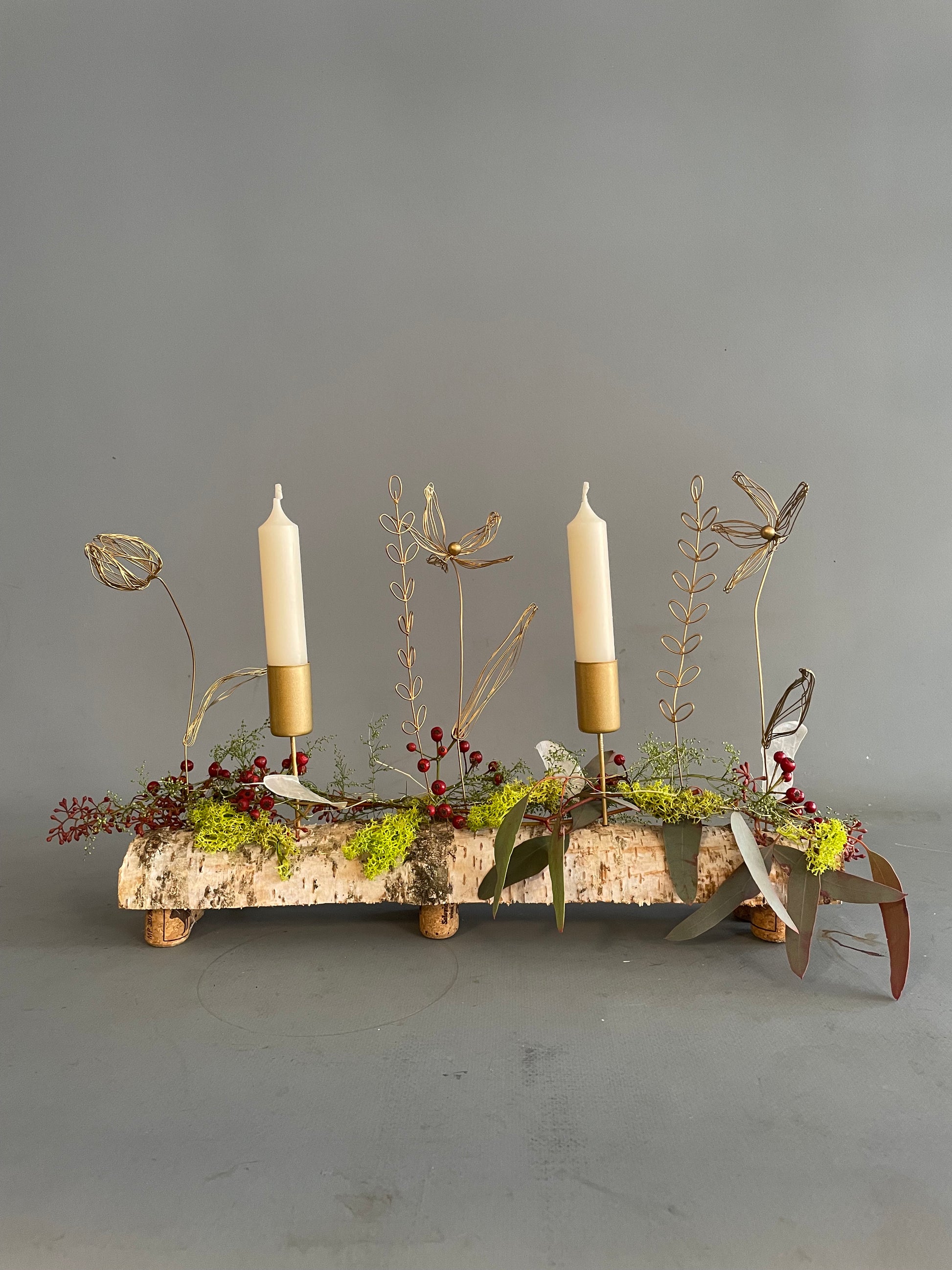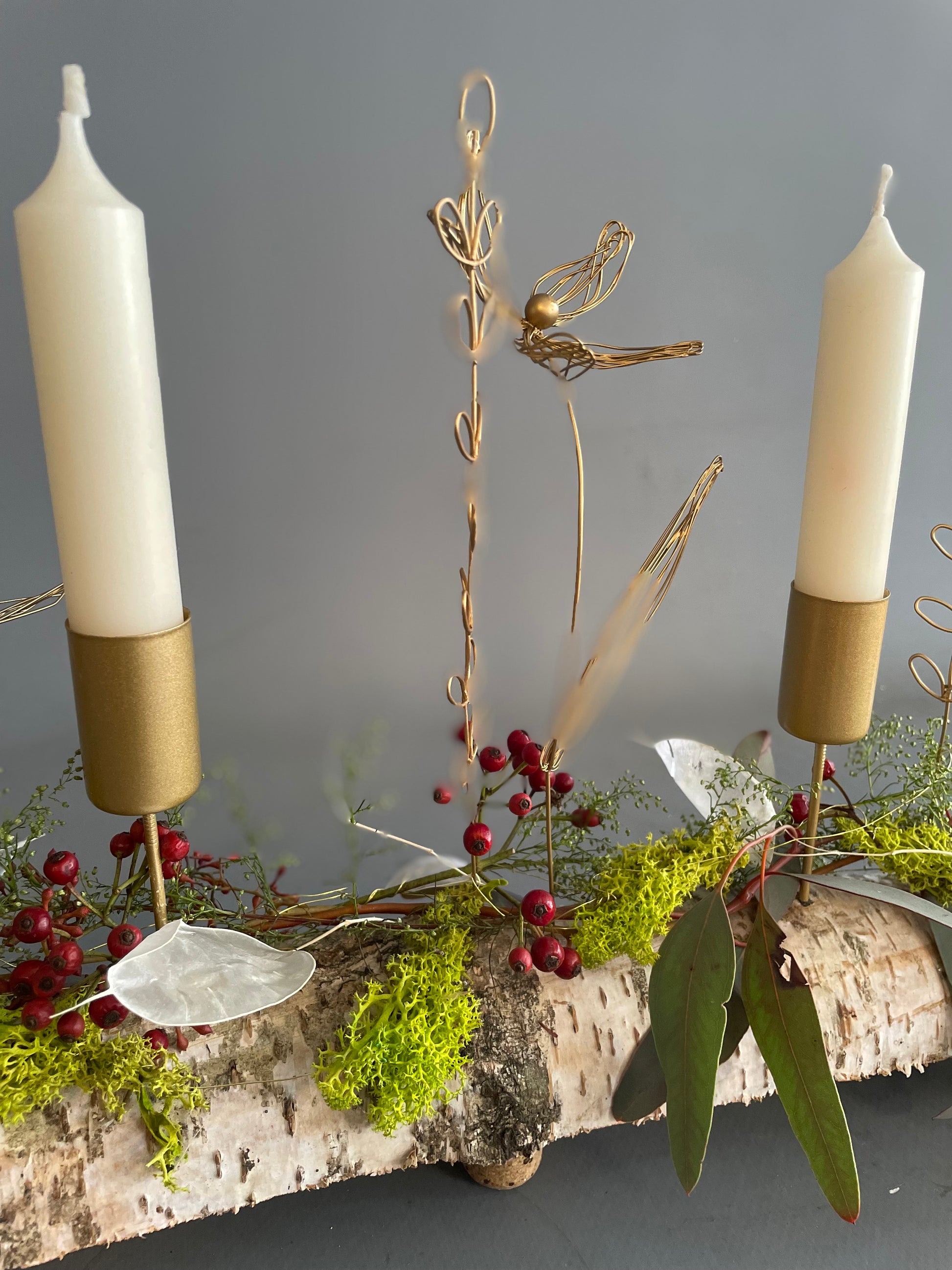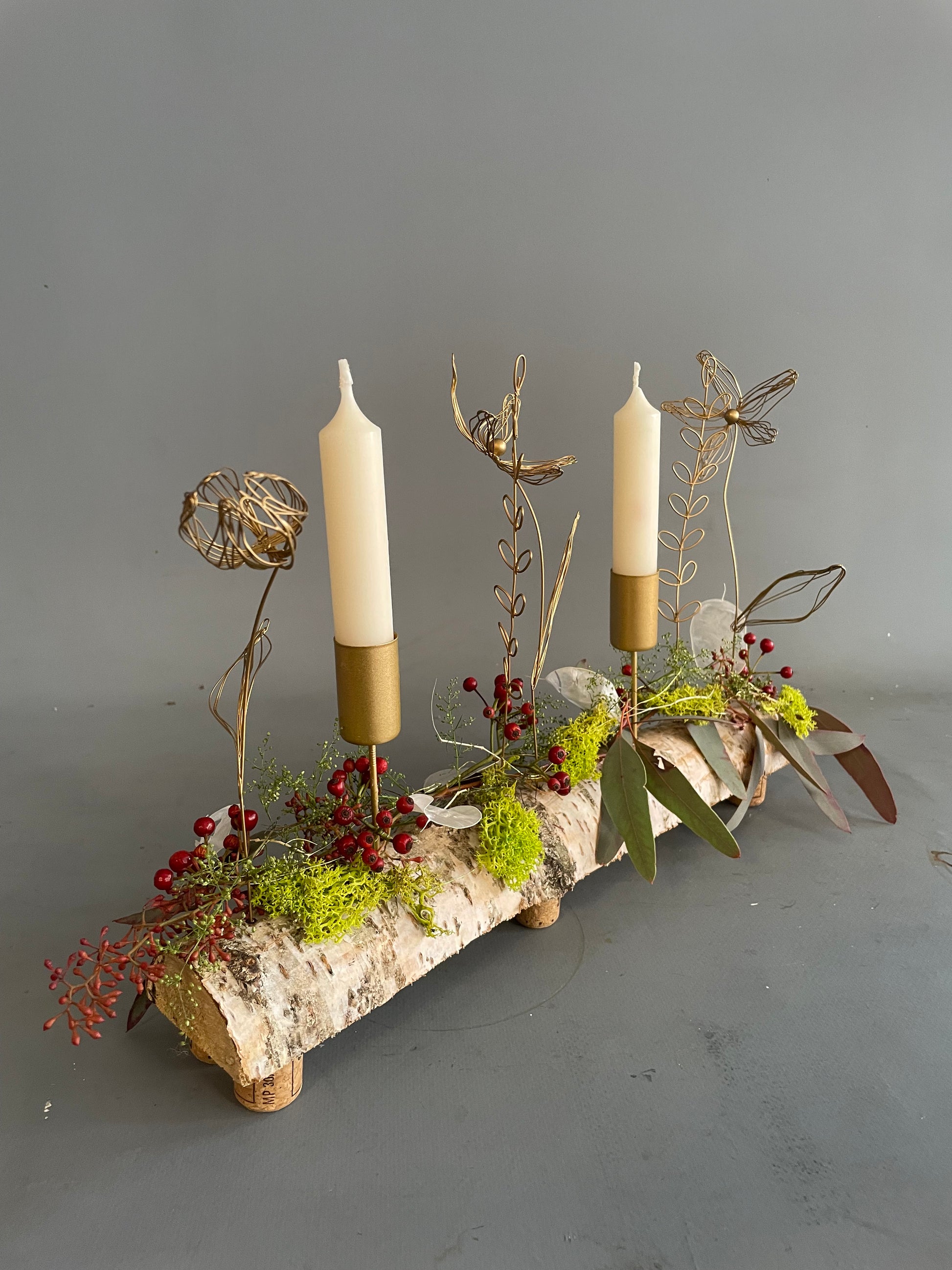 Blumen und florale formen aus goldenem Draht befestigt auf einem halbem Birkenstamm. Dekoriert mit präpariertem Moos, Beeren und Eukalyptus. 35 cm lang und ca 25 cm hoch. Mit 2 Haltern für Stabkerzen. (2 Kerzen mit dabei). Das Deko-Objekt ist sehr schmal gehalten und eignet sich gut für die Tischmitte, Sideboard oder auf das Fensterbrett.
